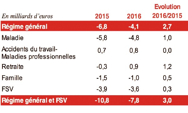 Chaque branche voit sa situation s’améliorer : la branche retraite est excédentaire, le déficit de la branche famille a été réduit d’un tiers, la branche accidents du travail enregistre un excédent pour la quatrième année consécutive et le déficit de la branche maladie diminue pour la troisième année consécutive, mais reste très important à – 4,8 milliards. L’objectif national des dépenses d’assurance maladie 2016 (+ 1,75 %), le plus faible taux depuis 1997, a été respecté.