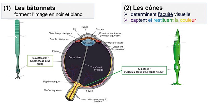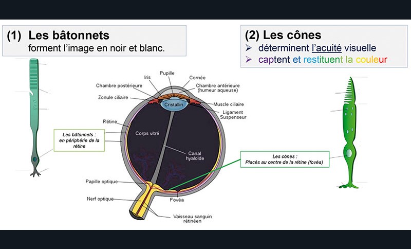 Schématiquement, l’œil forme les images grâce à deux types de photorécepteurs, fixés sur la rétine (fig. 1) :