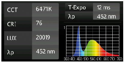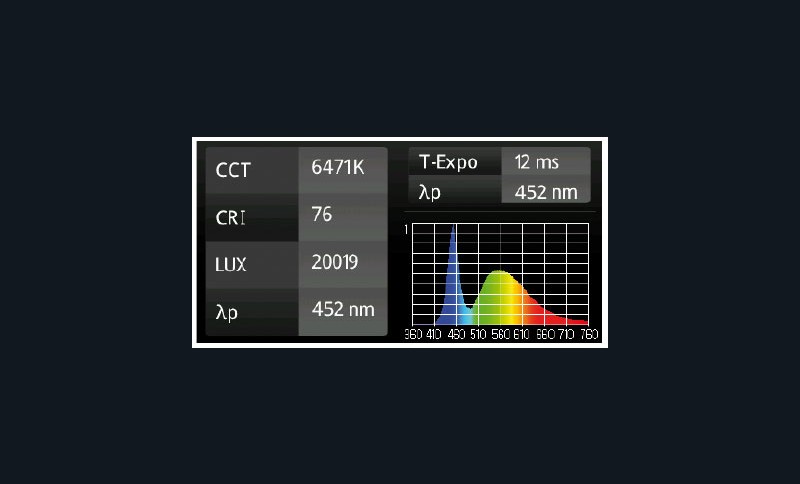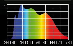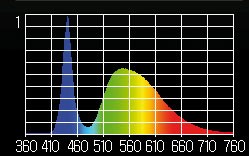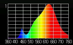 A 6 500 K, il est marqué par une forte pointe de lumière bleue à 452 µm, un trou dans les cyans et turquoise, une composante de jaune réduite et une part de rouge très faible.