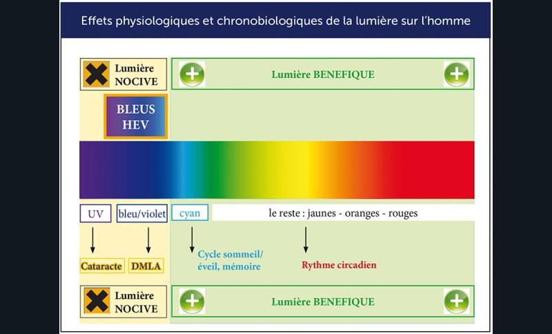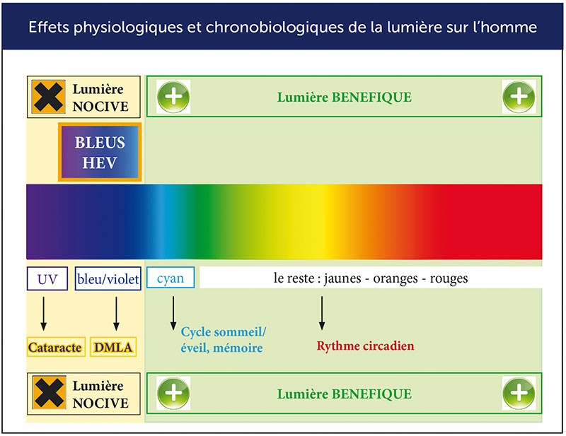 Mais il y a plus ennuyeux… Son spectre lumineux a une incidence néfaste sur le fonctionnement de l’œil, la santé et les rythmes biologiques. En effet, le spectre de la lumière a des impacts fondamentaux sur le fonctionnement de l’œil et sur notre santé. Certains sont nocifs, d’autres positifs (fig. 5).