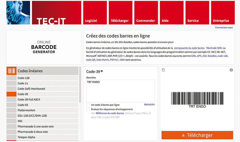 – un générateur de codes en ligne gratuit : https://barcode.tec-it.com/fr/Code39 ;