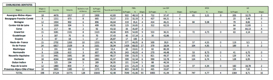 – La FSDL reste le premier syndicat représentatif des chirurgiens-dentistes et progresse encore au sein de la profession avec 45,06 % des voix contre 39,15 % 2015.
