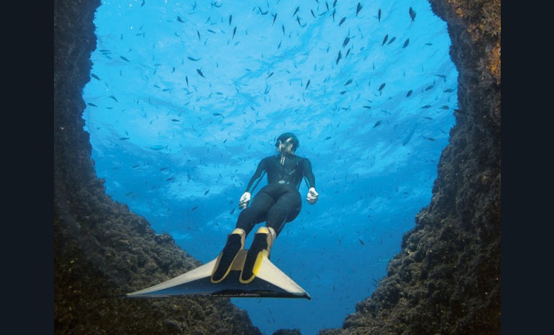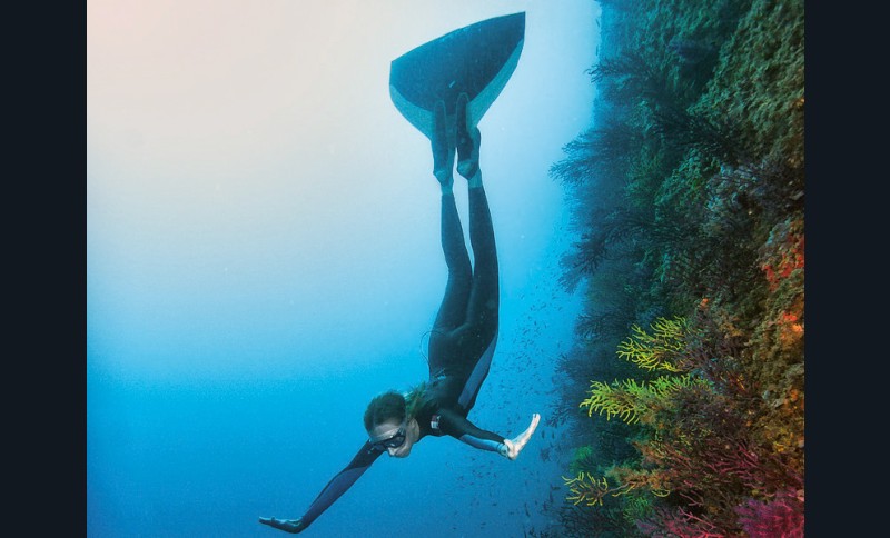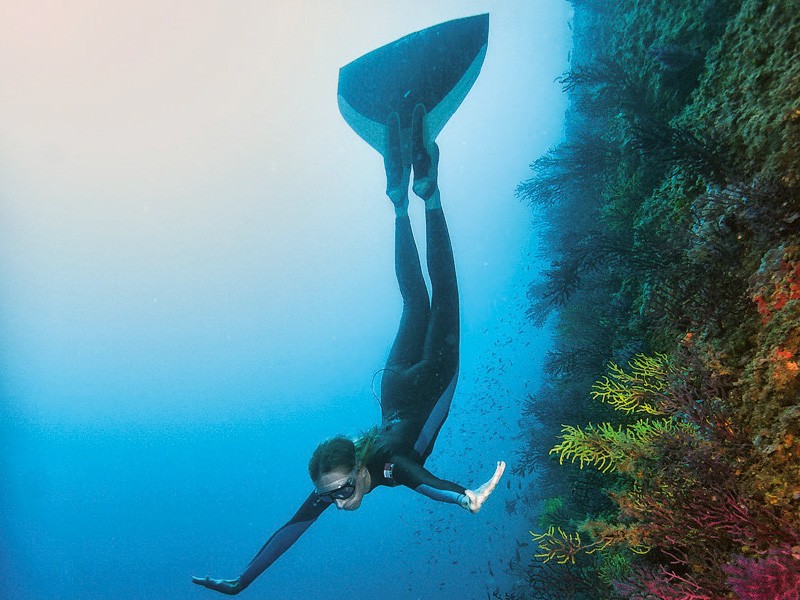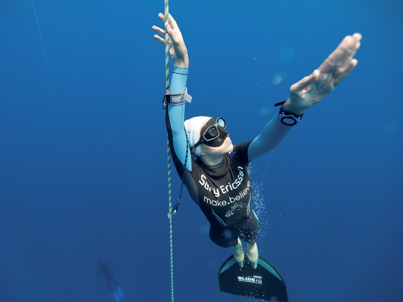 Baie de Villefranche-sur-Mer, un dimanche ensoleillé. Des touristes main dans la main, un glacier qui hèle les clients, et des bateaux qui quittent le port. Alice Modolo a pris le large, elle aussi, pour s’en aller loin, très loin du spectacle du bord de mer. Ici, c’est un silence total, à peine perturbé par le bruit du moteur de l’embarcation. La silhouette mince d’Alice s’agite. Elle répète les gestes avec les bras, reprend les consignes. La voilà prête pour le grand plongeon. Nez vers le ciel, elle ventile fort. Puis, en une fraction de seconde, elle bascule dans l’eau. Sans bouteille. Toujours gracieuse. Jamais d’à-coup. 5 mètres, 10 mètres, 30 mètres, 50 mètres, 70 mètres. Quelques minutes plus tard, elle remonte tout en douceur à la surface. Un grand souffle sort de sa bouche, puis les premiers mots. Alice Modolo est heureuse, ça se voit et ça s’entend. « À chaque fois que je descends en apnée, je me sens surpuissante, comme en dehors de toute réalité. C’est une sensation incroyable de totale liberté, mais aussi de maîtrise du corps. Tu te sens privilégié. L’homme ne s’imagine pas être capable de faire ça, on se surprend. »