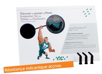 Avec everX Posterior, la société GC confirme une nouvelle fois sa position de leader innovant en matière de matériaux d’obturation composites : il s’agit ici d’un composite renforcé en fibres de verre courtes qui confèrent au matériau une résistance mécanique accrue. Notamment proposé pour l’obturation de cavités larges, les fibres limitent et empêchent le risque d’apparition de fissures, source principale d’échec par fracture des restaurations de gros volume.