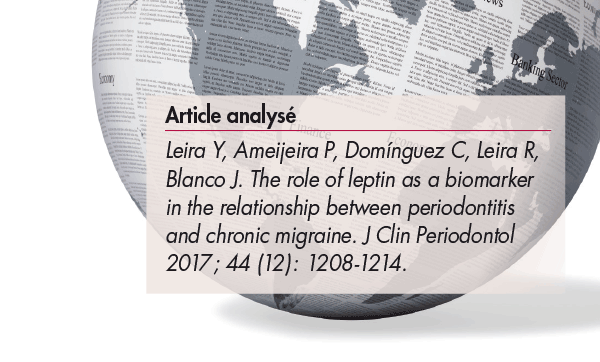 Les résultats d’une étude ont montré que les taux sériques de leptine (hormone/cytokine dérivée des adipocytes, qui s’exprime au cours de l’inflammation et de l’infection) sont augmentés chez les patients migraineux chroniques (après ajustement avec l’âge, le sexe et l’indice de masse corporelle). De plus, les sujets qui souffrent de parodontite ont des niveaux plus élevés de leptine sérique par rapport aux individus en bonne santé parodontale.
