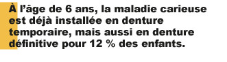 La prévalence de la maladie carieuse sur dent de 6 ans est de 12%, et de 11% pour le besoin de soins immédiat sur dent permanente. Il convient de rappeler que la moyenne d’âge de ces enfants est de 6 ans et que, par conséquent, les premières molaires ne sont évoluées, pour les enfants les plus précoces, que depuis moins d’un an.