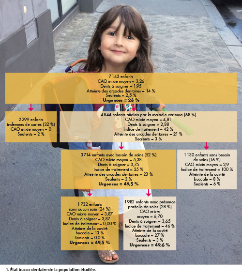 Parmi les enfants ayant besoin de soins, la moitié sont à classer au sein des urgences de soins (plus de 4 dents de lait atteintes et/ou une dent permanente atteinte).