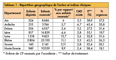 L’analyse géographique montre une distorsion des indices selon les départements, l’Ardèche présentant un CAO mixte moyen à 4,71, cet indice étant de 2,47 en Haute-Savoie. L’urgence de soins concerne 36% des enfants dépistés en Ardèche. A l’opposé, cette urgence est de 18% en Haute-Savoie. Parallèlement, c’est en Isère que la prise en charge des soins est la plus élevée avec un indice de traitement de 55,14% des lésions, l’indice le plus faible étant relevé dans la Drôme (27,29%).