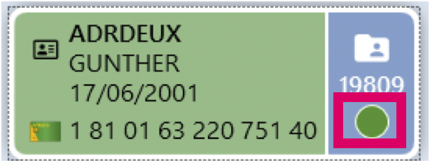 Votre logiciel vous épaule en matière d’identitovigilance grâce à un processus de comparaison des données selon la provenance, au moment de la lecture de la carte Vitale. Un indicateur de correspondance entre le dossier patient et les informations d’identification du patient de la carte Vitale se situe sous le numéro de dossier :