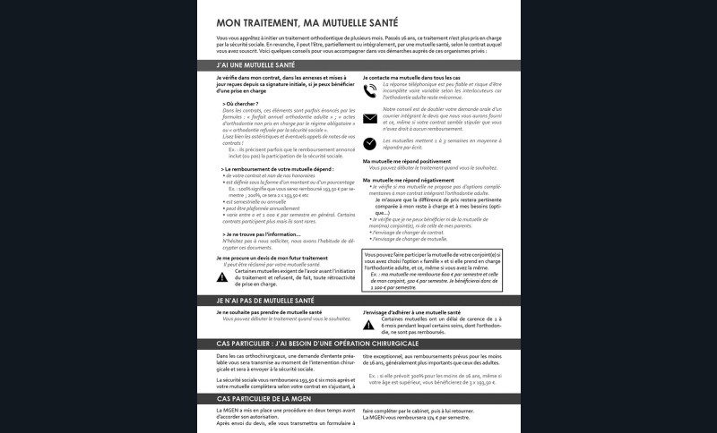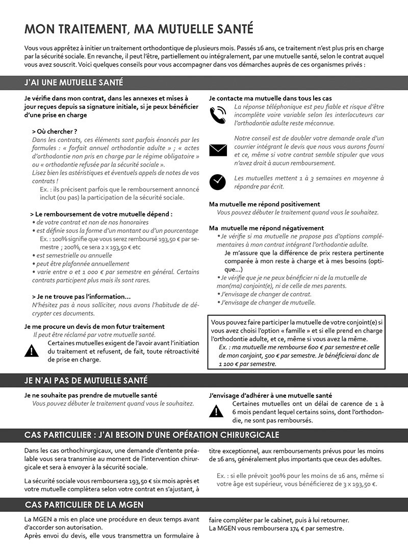 Pour guider les patients, nous avons eu l’idée de mettre en place une fiche remise en même temps que le devis (figure). Celle-ci explique la démarche, étape par étape, pour comprendre le fonctionnement des mutuelles. Les cas particuliers sont aussi expliqués, notamment en cas d’intervention chirurgicale des maxillaires.