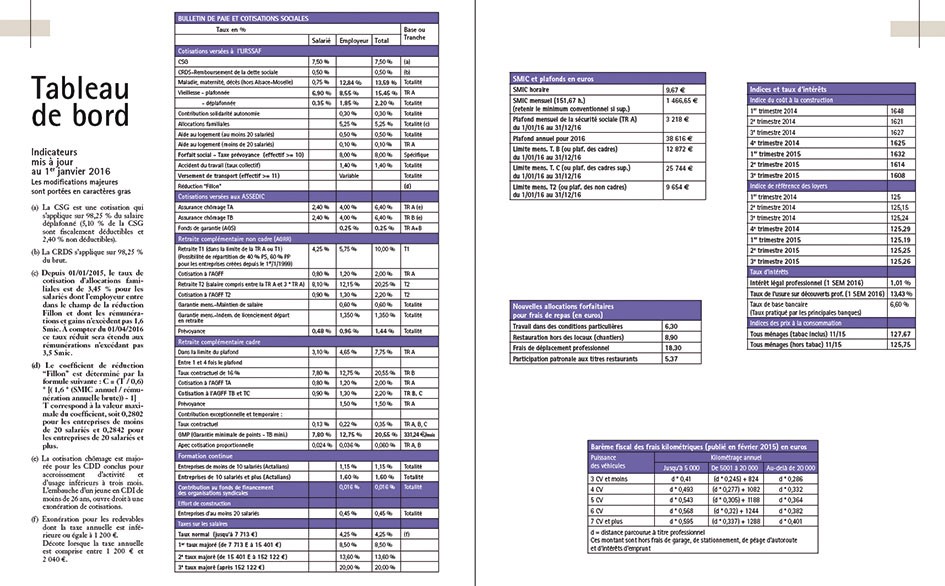 Vous y trouverez notamment le bulletin de paie et les cotisations sociales, les indices et taux d’intérêt, le barème fiscal des frais kilométriques, les nouvelles allocations forfaitaires pour frais de repas, etc.