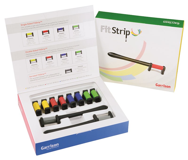 Le kit contient des bandelettes simple face et des bandelettes double face qui présentent toutes la capacité de s’adapter pour une utilisation rectiligne (réduction des contacts) ou incurvée (façonnage interproximal) en tournant simplement le cylindre à code couleur, pour éliminer ainsi la fatigue manuelle. Le manche interchangeable se fixe aisément sur tous les éléments FitStrip™, ce qui accroît la facilité d’utilisation et le confort du patient. La main du praticien ne pénètre pas dans la bouche, ce qui se traduit par une meilleure visibilité du champ opératoire et facilite le travail. FitStrip™ constitue en outre une solution intéressante pour la réduction interproximale grâce à la création de l’espacement nécessaire pour un mouvement de dent mineur si besoin.