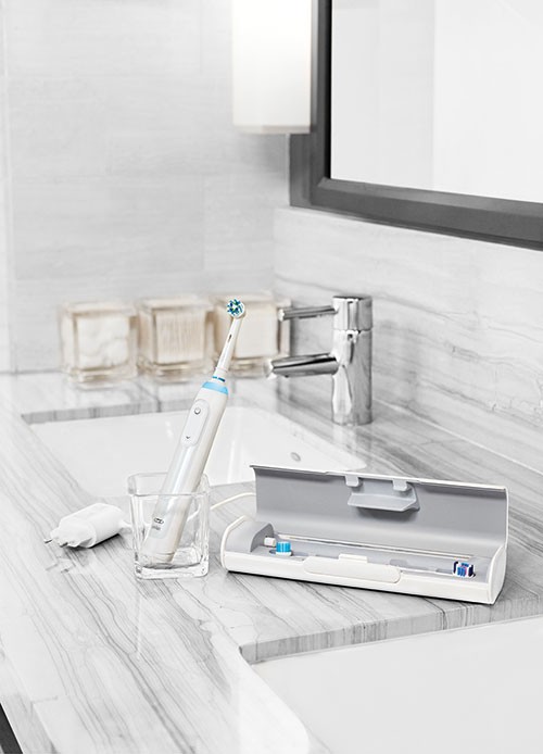 À noter : un étui de voyage “intelligent” permet de recharger la brosse ainsi que les dispositifs USB, comme un smartphone, avec une prise unique pour tous voltages. Un support amovible permet en outre de positionner le téléphone sur le miroir afin d’assurer une utilisation pendant le brossage.