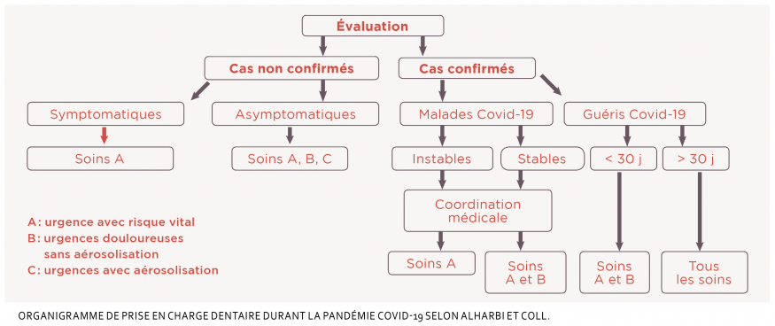 Les patients non testés et sans aucun symptôme peuvent bénéficier des traitements d’urgence (A, B, C), les patients non testés symptomatiques et les patients malades confirmés Covid+, seulement des urgences vitales (A). Les malades Covid stables et les patients guéris depuis moins de 30 jours peuvent être traités pour les urgences douloureuses sans aérosolisation (A et B), avec coordination médicale pour les malades. Seuls les patients guéris de plus de 30 jours peuvent bénéficier de tous les traitements. Les auteurs insistent par ailleurs sur les mesures de protection en minimisant les aérosols par l’usage de la digue à chaque fois que possible, par une désinfection à l’aide d’un bain de bouche de 15 secondes à la povidone iodée à 0,23 % et par l’emploi de matériel à usage unique notamment. Ils insistent aussi sur le caractère non restrictif de leurs recommandations et considèrent que la décision finale du traitement appliqué au cas par cas doit être laissée à l’appréciation professionnelle du praticien.