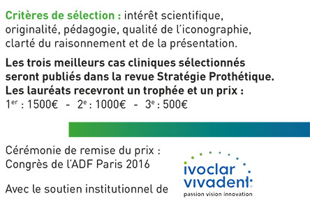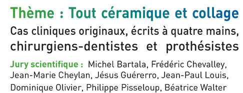 Accueil > Actualités > Évènement Grand prix de Prothèse Dentaire Publié le 19.05.2016. Partager sur facebook Partager sur twitter Partager sur linkedin Commenter Sous l'égide de la revue Stratégie Prothétique Animé par Yves Allard et Hervé Maréchal. Ouvert aux chirurgiens-dentistes et aux prothésistes. Recommandation aux auteurs >>> Règlement >>> Thèmes abordés #Évènement Commentaires Laisser un commentaire Annuler la réponseVous devez vous connecter pour publier un commentaire. Newsletter Inscrivez-vous à la newsletter pour recevoir chaque semaine l’essentiel de L’Information Dentaire Je m'inscris E-learning DPC 27 formations E-learning 100% prises en charge. Consulter le programme