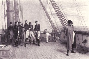 Au lendemain de Waterloo, c’est ouvertement que Napoléon prépare à la Malmaison son « voyage scientifique ». Depuis un an, la bien-aimée créole n’est plus là pour le guider, mais la grande demeure est encore pleine des parfums d’Amérique qu’elle y a semés, dont celui, délicieux, de la liberté. On fait diligence pour monter ce départ sur le seul pied digne de l’ex-majesté : l’appareil impérial. Outre des cartes et un imposant matériel d’observation, il embarquera avec bibliothèque, argenterie, vaisselle (tout cela légèrement emprunté à la Nation), vêtements d’apparat et même fauteuil aux allures de trône – à toutes fins utiles. On appareillera à Rochefort où attendent les frégates La Méduse et La Saale. Le trajet en calèche à quatre chevaux est une sorte de fuite de Varennes à l’envers : passé la Loire, les curieux s’attroupent ; à Niort, on reconnaît le civil qui l’occupe ; à Rochefort, les vivats fusent, la foule vibre, la Grande Armée éparse souffle sur ces braises…