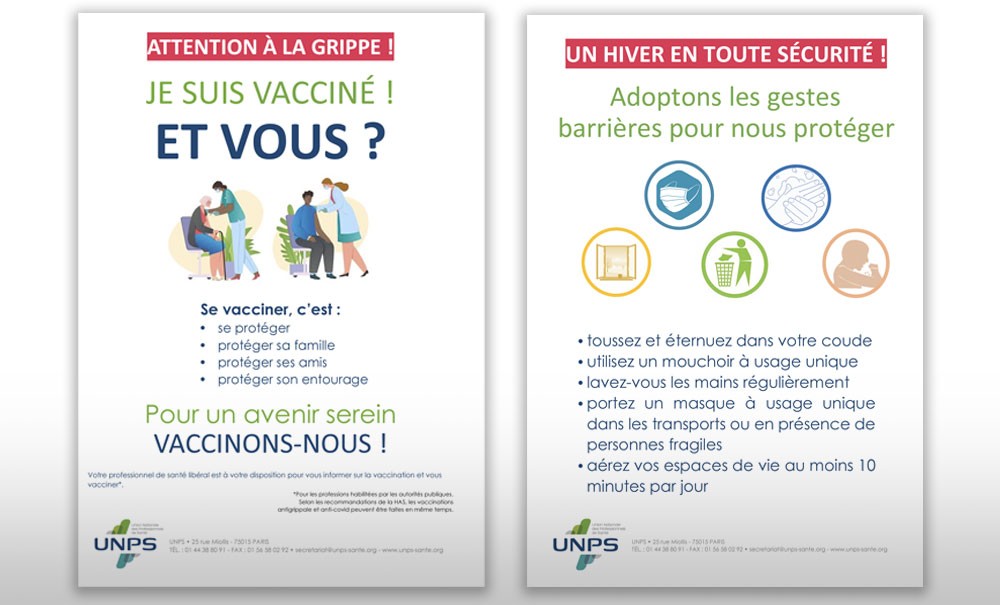 Alors que la campagne de vaccination contre la grippe saisonnière a débuté le 17 octobre, l’Union nationale des professionnels de santé (UNPS) appelle « l’ensemble des professionnels de santé libéraux à se faire vacciner et encourage au maintien des gestes barrières pour éviter la prolifération des virus de l’hiver ». Elle propose sur son site internet deux affiches à apposer dans les salles d’attente invitant les patients à se faire vacciner et à respecter les gestes barrières.