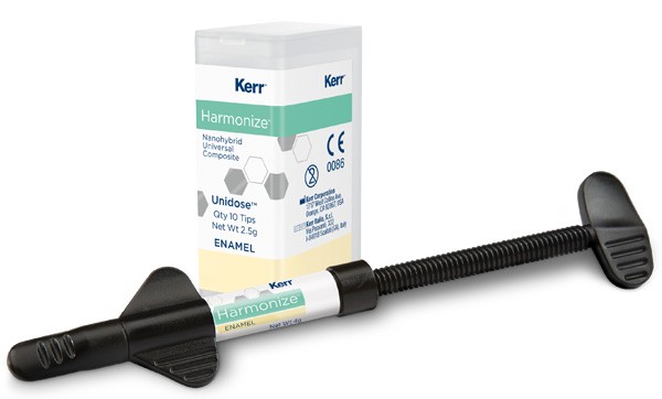 Harmonize est le joli nom choisi par la société Kerr pour son nouveau composite de restauration. Il s’agit d’un matériau nanohybride, à l’instar de nombre de ses concurrents sur un segment de marché qui commence à être passablement encombré. La propriété mise en avant est ici un effet dit « caméléon » qui permettrait au matériau de s’harmoniser sur le plan chromatique avec le support dentaire. Cela serait notamment conféré par un système exclusif de nanoparticules de la charge qui induirait une qualité particulière au niveau de l’absorption et de la réflexion de la lumière. Le produit se décline de manière assez classique en seringues et en compules, mais également en capsules « unidose », que nous n’avons pas essayées, mais qui nous semblent intéressantes sur le plan ergonomique.