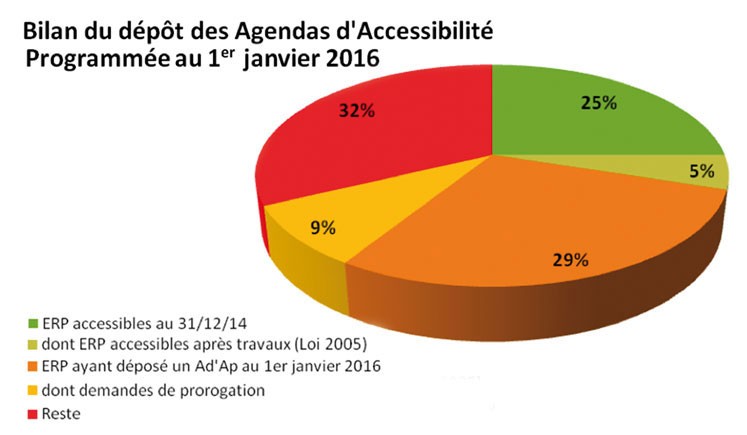 Depuis fin 2014, date de lancement du dispositif, 378 140 dossiers d’accessibilité programmée (Ad’Ap) ont été déposés en mairie ou préfecture, selon un premier bilan issu des remontées préfectorales dévoilé par Ségolène Neuville, secrétaire d’État en charge des personnes handicapées, le 21 janvier. Le compte n’y est pas. En effet, fin 2014, sur un million d’établissements recevant du public (ERP), seuls 300 000 étaient aux normes. Avec ceux qui sont désormais entrés dans une démarche d’accessibilité sur trois ans, délai que procure l’Ad’AP, il reste près de 320 000 établissements qui n’ont toujours pas satisfait à leurs obligations.