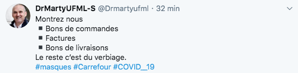 « Montrez nous, les bons de commandes, les factures les bons de livraisons, le reste c’est du verbiage », a réagi Jérome Marty le président du syndicat de médecins UFML sur Twitter. La polémique ne fait que débuter….
