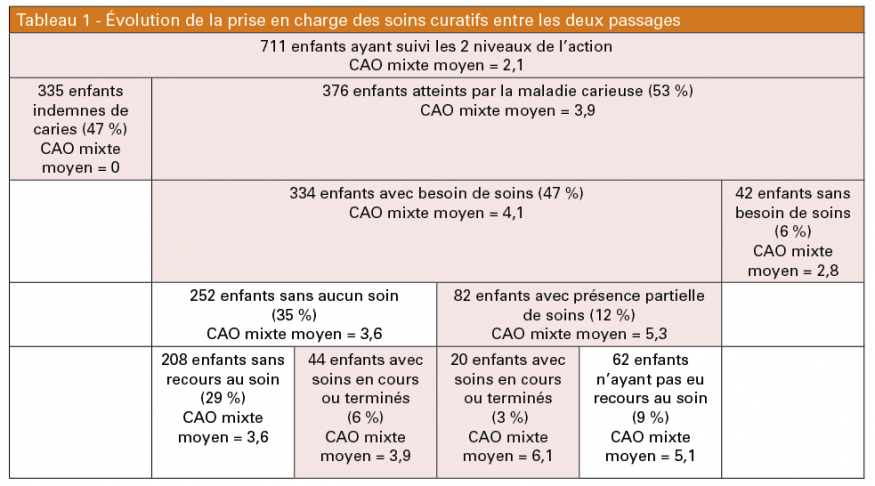 Chez les 376 enfants qui avaient été atteints par la maladie carieuse, 334 avaient besoin de soins. Parmi eux, 19 % (64) ont eu recours aux soins entre les deux passages (tableau 1).
