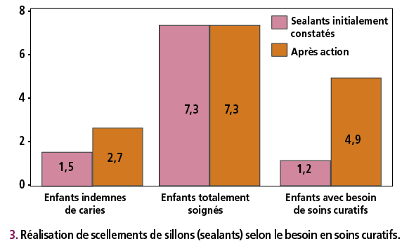 Au premier passage, 1,7 % des enfants avaient bénéficié d’actes préventifs par le biais de pose de sealants sur les premières molaires permanentes. Ces scellements de sillons sont particulièrement recommandés chez les enfants présentant un risque carieux individuel important (fig. 3).