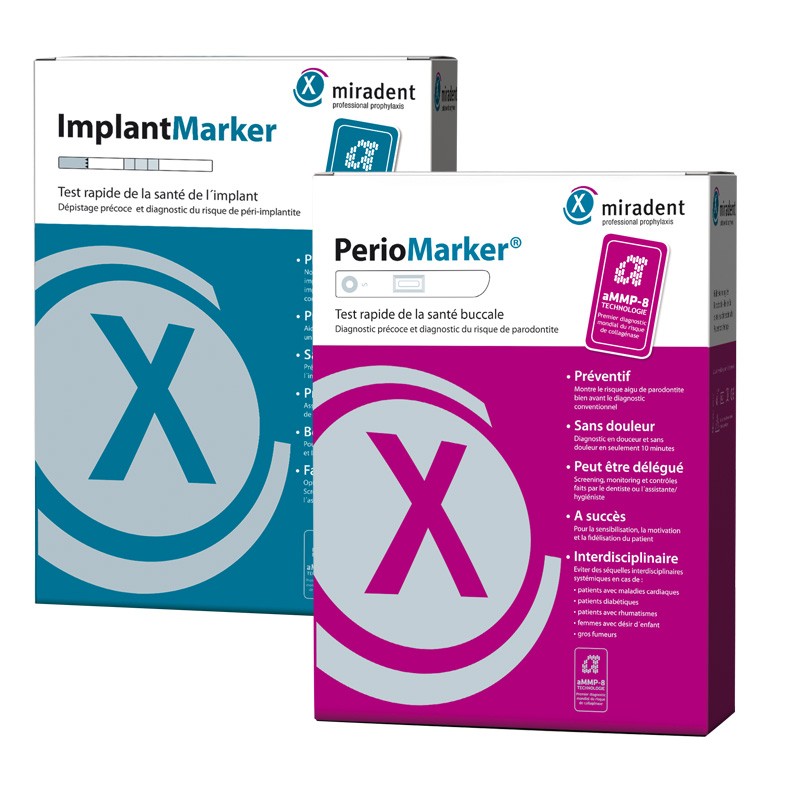 Miradent, marque du groupe Hager & Werken, commercialise PerioMarker et ImplantMarker sous forme de kits destinés au diagnostic précoce des risques de parodontites et de péri-implantites.