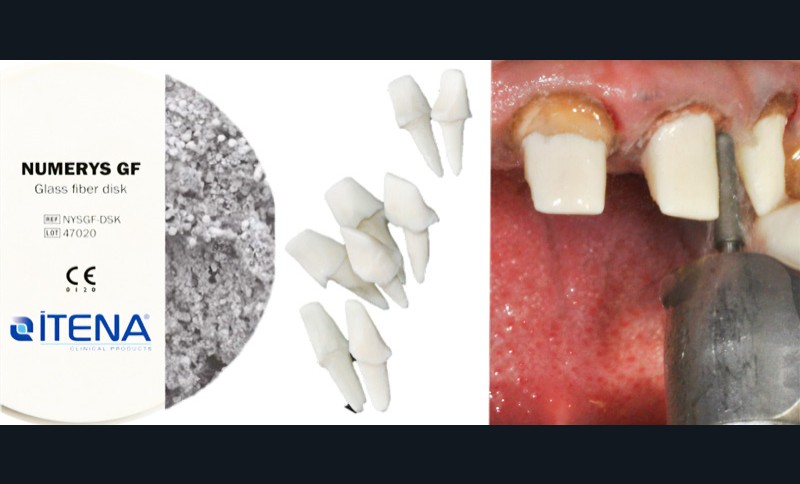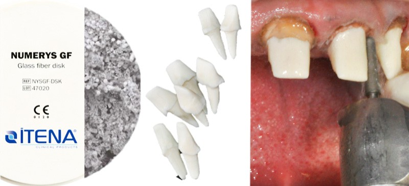 Lancé par Itena en 2019, le Numeryse GF est constitué de 75 % à 80 % de fibres de verre unidirectionnelles enrobées dans de la résine époxy. Les inlays-cores ainsi réalisés sont revêtus du silane spécifique de la marque (Silan-It, Itena). Une fois tous les assemblages réalisés, les dents ont été placées dans un dispositif spécifique appliquant une force oblique constante sur la face linguale du pilier à 2 mm du bord libre (angle = 135°, vitesse = 2 mm/minutes) jusqu’à la rupture. Les résultats de ces tests in vitro montrent que la contrainte nécessaire à la rupture est la plus faible pour les inlays-cores en Enamic (6,05 MPa) puis en PEEK (9,48 MPa), tandis que les inlays-cores en Numerys GF (15,35 MPa) et les RCR directes en tenon fibré (15,88 MPa) sont les plus résistants. Les types de fractures constatées sont difficilement interprétables, mais on ne note aucune fracture uniquement limitée à la dent avec l’Enamic et, à l’inverse, aucune fracture de la pièce seule en Numerys GF. La plupart des fractures sont mixtes et concernent à la fois la pièce et la dent à un niveau plus ou moins apical.