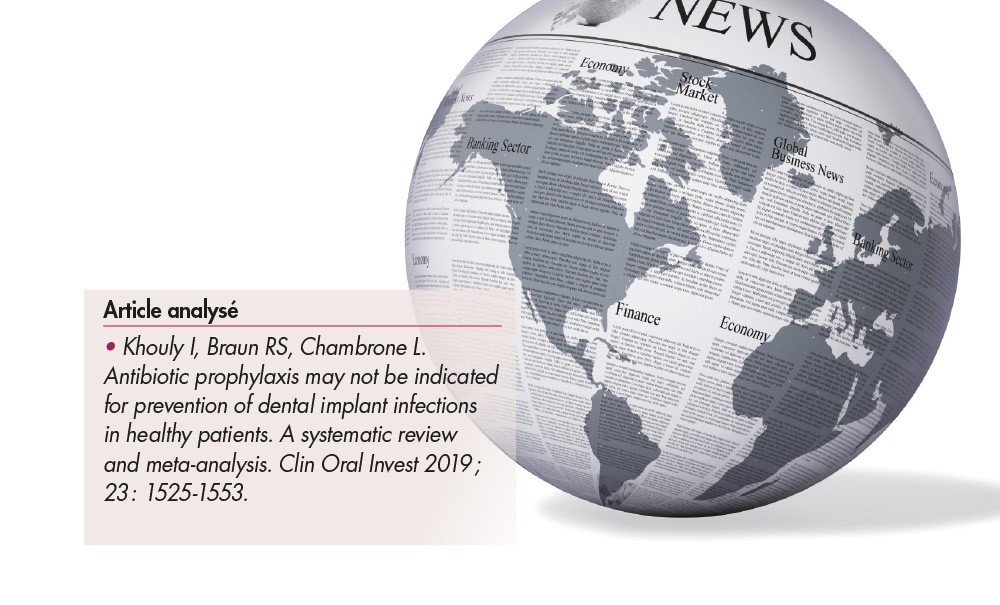 Cette revue systématique de la littérature couplée à une méta-analyse est rigoureusement construite et ses conclusions méritent bien entendu d’être prises en compte. Ces données prennent d’autant plus de consistance dans le concert international de la lutte contre l’antibiorésistance. Cependant, il est à remarquer qu’aucun critère relatif à la mise en place chirurgicale des implants n’a été retenu. Il serait probablement intéressant de faire ce type d’analyse en tenant compte d’une mise en place immédiatement après une avulsion dentaire ou d’une mise en fonction immédiate ou encore du type d’os concerné. Cela permettrait peut-être de dégager des sous-groupes de patients plus pertinents chez lesquels une antibioprophylaxie dans ce cadre serait efficiente.