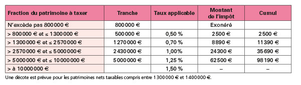 L’ISF est calculé sur l’ensemble de la valeur nette taxable du patrimoine qui excède le seuil d’imposition (1,3 million d’euros pour 2016) selon le tarif indiqué dans le tableau ci-dessous.