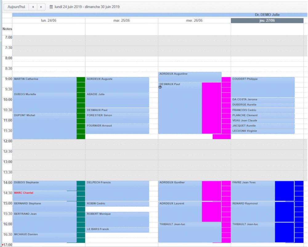 Ces fonctionnalités sont interprétées par cet agenda comme dans votre version au cabinet. L’envoi de SMS pour les patients est activable et paramétrable dans cette interface. De même, les rendez-vous générés via la prise de rendez-vous en ligne sont bien évidemment intégrés dans votre planning.