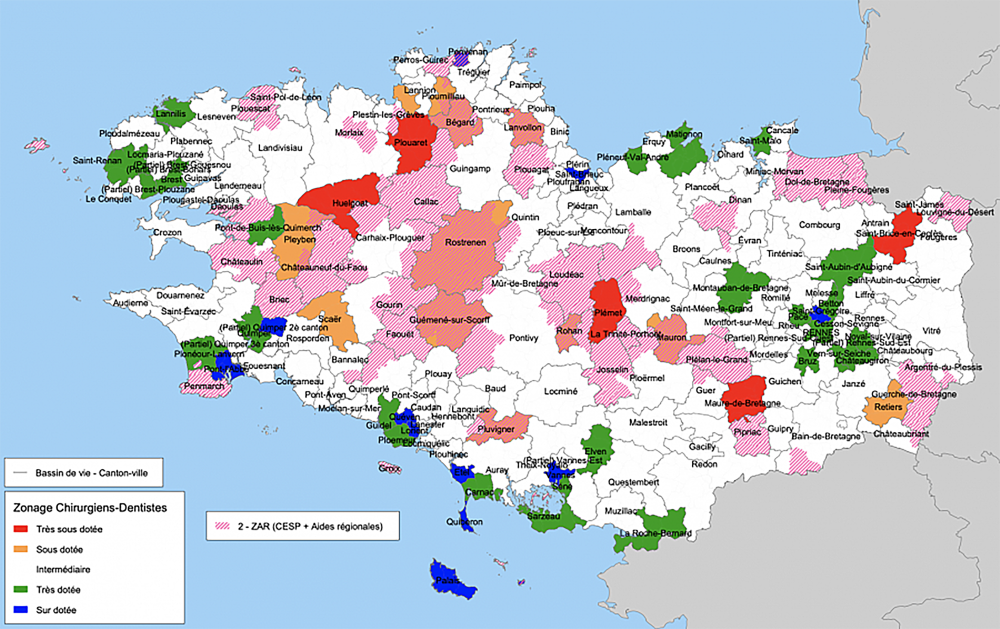 Et toute installation, y compris hors primo installation, dans ces ZAR donne lieu à une aide d’un montant de 12 500 € prélevée sur le fonds d’intervention régional (FIR), une enveloppe annuelle (4,1 milliards d’euros en 2020) répartie entre les 18 ARS selon leurs besoins et leur population. Au final, 11,1 % de la population bretonne se trouve désormais classée en ZAR. Les zones très sous-dotées définies en 2014 restent éligibles aux aides existantes pour les libéraux : le contrat d’aide à l’installation de 25 000 € à la signature pour un engagement de 5 ans et le contrat d’aide au maintien, 3 000 € par an pendant trois ans. Avant de publier cette nouvelle cartographie, l’ARS a consulté l’URPS-CD et le conseil régional de l’Ordre qui ont donné leur accord. « Cette mesure est entrée en vigueur 1er janvier 2022 et se poursuivra jusqu’à la révision du zonage des chirurgiens-dentistes au niveau national, indique l’ARS. Depuis 2014 celui-ci n’a fait l’objet d’aucune actualisation malgré l’évolution de l’offre de soins, aucune négociation conventionnelle n’ayant été menée à ce jour » avec l’Assurance maladie et les représentants de la profession.