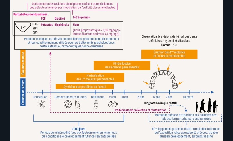 Un consensus a émergé autour de la période dite des « 1 000 premiers jours » qui commence dès la conception et qui s’étend jusqu’aux 2 ans de l’enfant. Tous les experts s’accordent sur le fait que cette période (et même la période préconceptionnelle) est une fenêtre de vulnérabilité extrême face aux facteurs environnementaux. Grâce au développement d’études sur la DOHaD – ou origine développementale des maladies –, nous savons à présent que des expositions ayant affecté un organisme au cours de la vie fœtale ou la petite enfance peuvent augmenter le risque de voir se développer un grand nombre de pathologies à l’adolescence ou à l’âge adulte, voire au cours des générations suivantes [11]. Considérer l’émail dentaire comme le reflet des conditions environnementales très précoces des individus et, de manière plus générale, la sphère orale comme la cible et le marqueur d’exposition à de nombreux facteurs environnementaux devient un enjeu de santé publique.