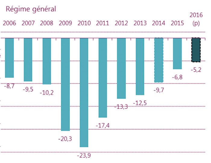 En 2016, selon la CCSS, le déficit du régime général serait à nouveau en recul de 1,6 milliard d’euros par rapport à 2015.