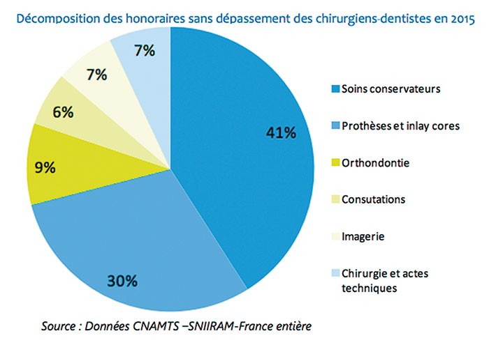 Les honoraires totaux des chirurgiens-dentistes se sont élevés à plus de 9,1 milliards en 2015 (+ 1,4 %) dont 36 % pris en charge par l’assurance maladie, on vient de le voir, le reste dépendant des assurances complémentaires (39 %) et des ménages (25 %). Les soins prothétiques n’ont représenté que 11 % de l’activité en 2015 (13 millions d’actes), mais pèsent pour plus de la moitié dans les honoraires totaux. À l’inverse, les soins conservateurs représentent 42 % de l’activité (30 millions d’actes), mais seulement 15 % du total des honoraires (1,5 milliard).