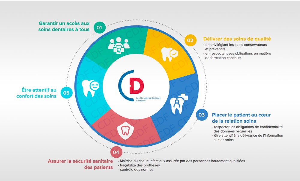 Les CDF publient le 23 janvier une « Charte d’engagement du chirurgien-dentiste » à afficher dans le cabinet. « Un outil de communication simple à destination des patients pour valoriser les bonnes pratiques, promouvoir la qualité de notre environnement professionnel, et répondre à une demande de transparence », selon le syndicat. La charte se décline en cinq points :