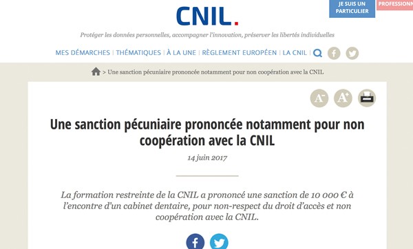 La CNIL a donc engagé une procédure de sanction à l’encontre du cabinet dentaire, considérant « qu’il y avait bien un manquement au droit d’accès du patient prévu par la loi », « que les obligations déontologiques auxquelles sont soumises les professions médicales, notamment celles liées au secret médical, ne pouvaient justifier dans ce cas d’espèce une absence de communication du dossier médical au plaignant » et « que le cabinet dentaire avait fait preuve d’un défaut manifeste de prise en compte des questions Informatique et Libertés et avait méconnu son obligation de coopération avec la CNIL résultant de la loi ».