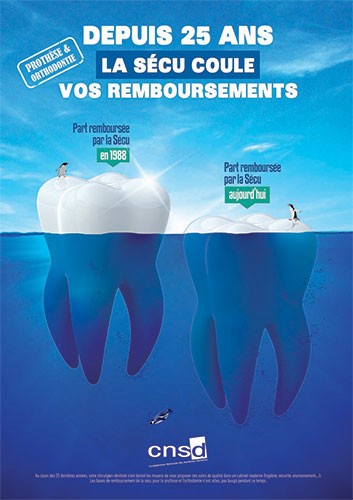 Le syndicat propose à tous les praticiens d’accrocher dans leur salle d’attente l’affiche reproduite ci-contre et téléchargeable sur son site internet (www.cnsd.fr). Objectif : dénoncer vingt-cinq ans de non-revalorisation du SPR et du TO. Avec ce slogan : « La Sécu coule vos remboursements », la CNSD dit vouloir « rappeler au grand public que la profession n’est pas responsable de l’augmentation du reste à charge des patients », et que les pouvoirs publics « ont délibérément abandonné la prise en charge des actes dentaires par le gel des bases de remboursements ». « Au cours des vingt-cinq dernières années, votre chirurgien-dentiste s’est donné les moyens de vous proposer des soins de qualité dans un cabinet moderne (hygiène, sécurité, environnement…). Les bases de remboursement de la Sécu pour la prothèse et l’orthodontie n’ont, elles, pas bougé pendant ce temps », résume l’affiche. « Les chirurgiens-dentistes ne supportent plus d’être les boucs émissaires d’un contexte dont ils ne sont pas responsables », conclut le syndicat. Une affiche qui aura peut-être le mérite de faire réagir les patients et d’engager le débat.