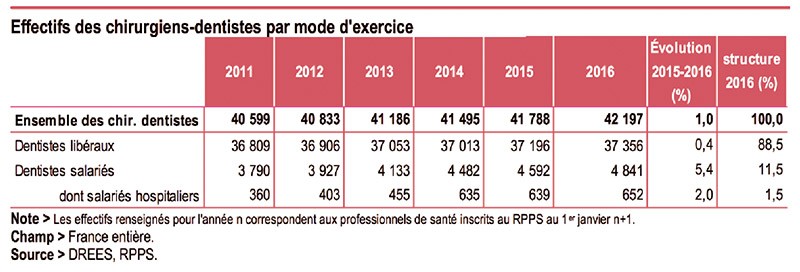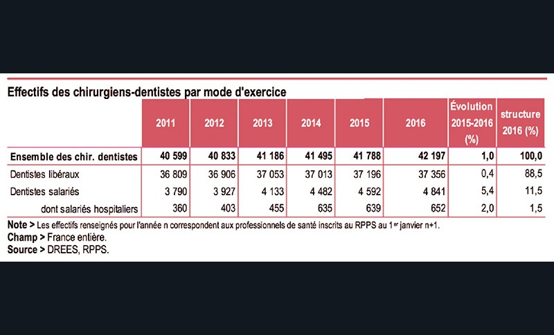 42 197 chirurgiens-dentistes sont recensés en France en 2016, dont environ 950 en outre-mer. « Les effectifs augmentent de 0,8 % par an depuis 2011, en raison de l’élargissement progressif du numerus clausus, passé de 930 par an au milieu des années 2000 à près de 1 200 depuis 2012, souligne le rapport. Auparavant, la démographie était orientée à la baisse (- 0,3 % par an entre 2006 et 2010). »