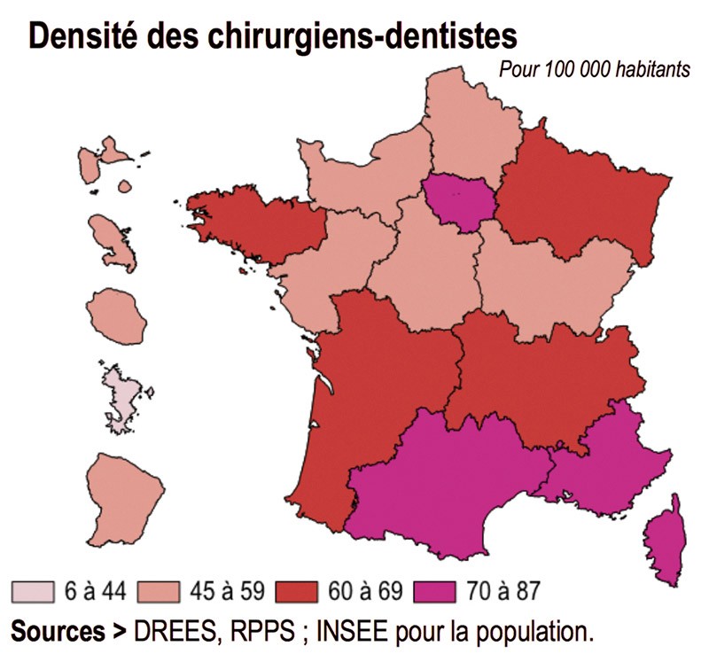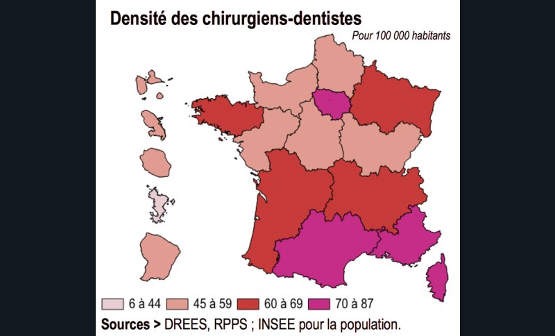 Enfin, avec le découpage des nouvelles régions, les écarts démographiques entre le nord et le sud se font jour. Alors que la densité moyenne est de 63,2 chirurgiens-dentistes pour 100 000 habitants, elle est supérieure à 70 pour 100 000 en Ile-de-France et dans les régions du sud (PACA, Occitanie et Corse), tandis qu’elle est inférieure à 45 pour 100 000 en Normandie par exemple.