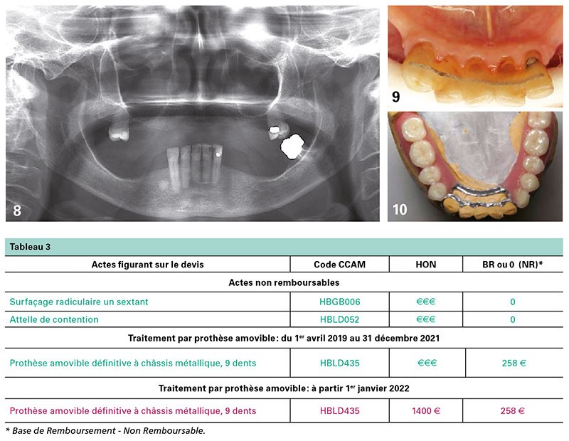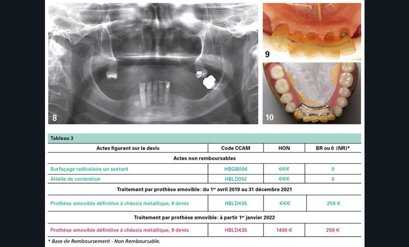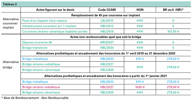 Dans le cas exposé figures 5 à 7, le traitement prothétique proposé pour remplacer la 45 peut être la couronne sur implant ou le bridge traditionnel 44-[45]-46. Cette dernière solution est moins favorable, sur le plan de la conservation tissulaire, que la solution implantaire. Le devoir de conseil du chirurgien-dentiste va donc naturellement l’amener à conseiller le patient en faveur de cette solution implantaire (tableau 2).
