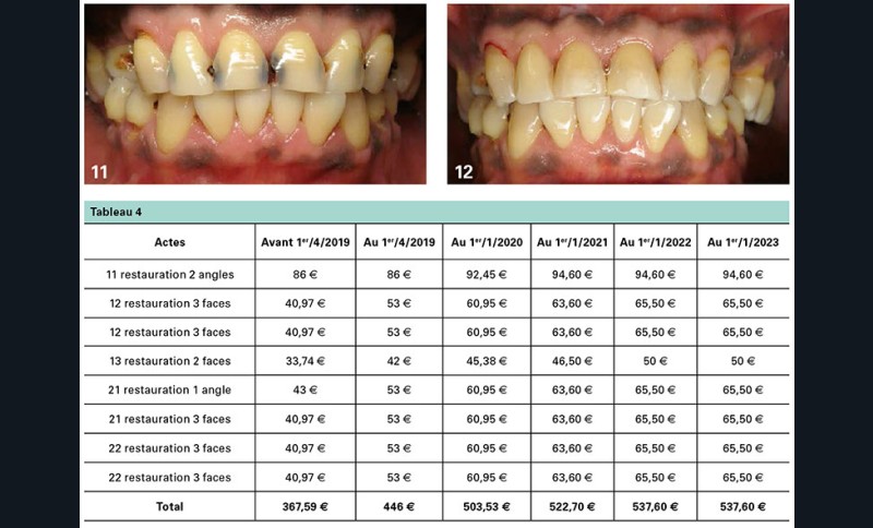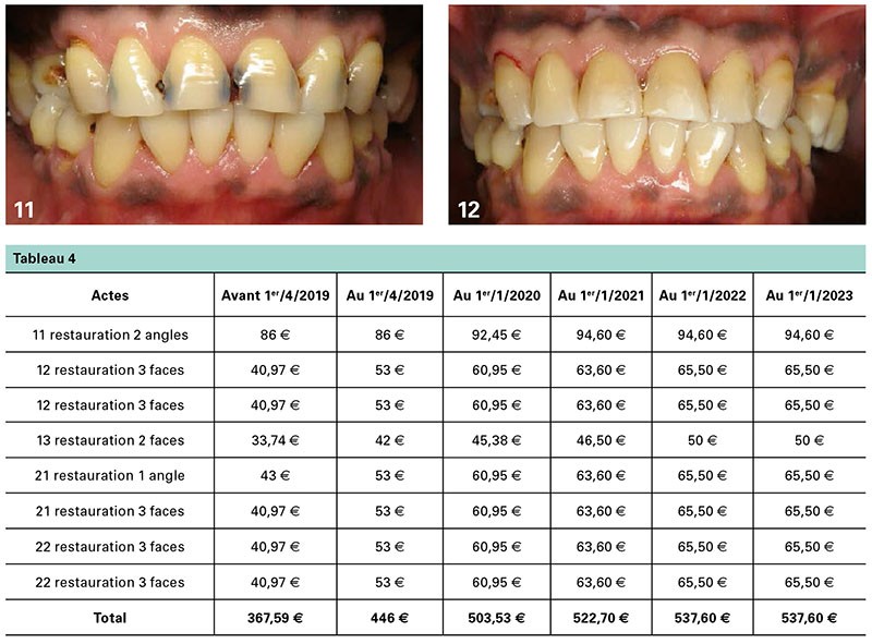 Le dernier exemple clinique que nous présentons concerne une séquence de soins conservateurs (séance programmée) consistant en des restaurations par matériau inséré en phase plastique (fig. 11 et 12, tableau 4).