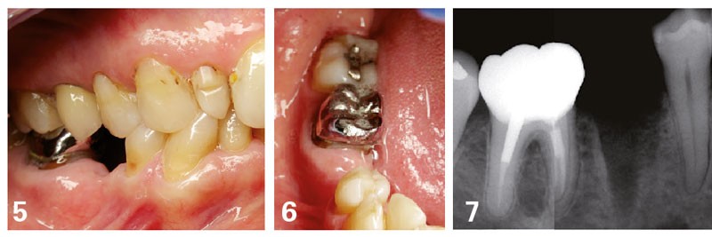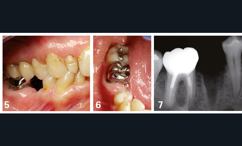 Le raisonnement suit alors l’exemple précédent, avec une possibilité pour le bridge métallique : une préparation a minima (économie tissulaire de 44) et, surtout, la volonté du patient satisfait de la présence de la couronne métallique sur 46 sans aucune complication.