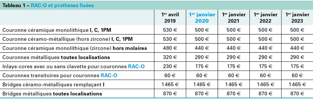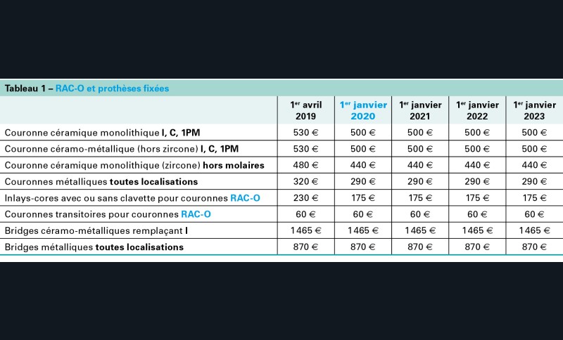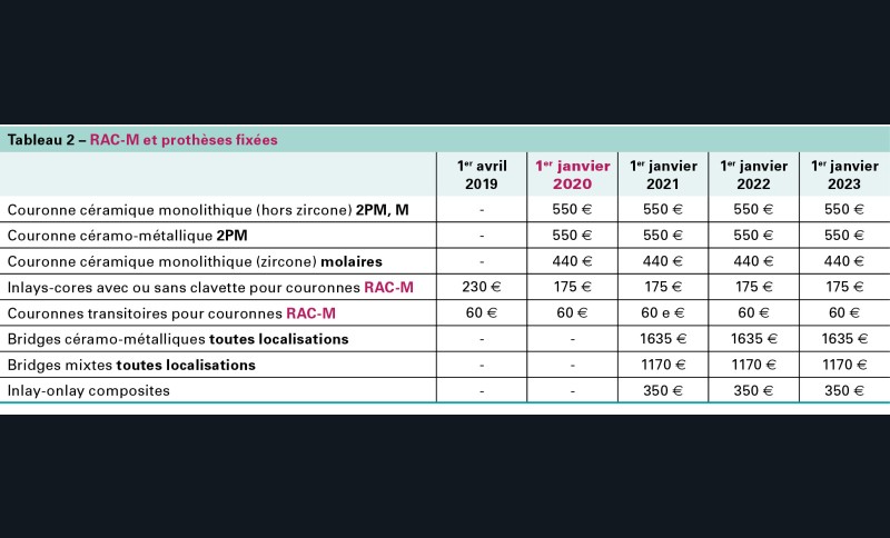 Enfin l’entrée en application du dispositif « paniers » (RAC-0 et RAC-M) est prévue de manière échelonnée dans le temps, à partir du 1er janvier 2020, mais le plafonnement des honoraires de certains actes faisant partie des paniers est prévu dès le 1er avril 2019, comme on peut le voir dans les tableaux 1 et 2. Le tableau 3 récapitule les valeurs cibles des honoraires des prothèses fixées unitaires lorsqu’elles inégreront les 3 paniers au 1er janvier 2020.