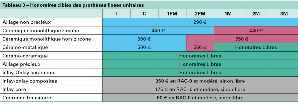 L’article 7-1 de la convention met en place une différenciation des prothèses fixées suivant le matériau (céramique monolithique [zircone ou hors zircone], céramo-métallique, métallique, céramo-céramique, résine ou composite) et la localisation (incisives, canines, 1re prémolaire, 2e prémolaire, molaires).