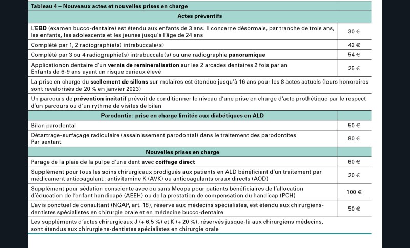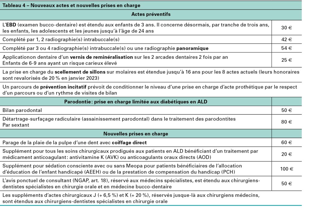 La Convention dentaire de 2018 élargit le champ de la prévention, introduit de nouveaux actes et de nouvelles prises en charge (tableau 4).