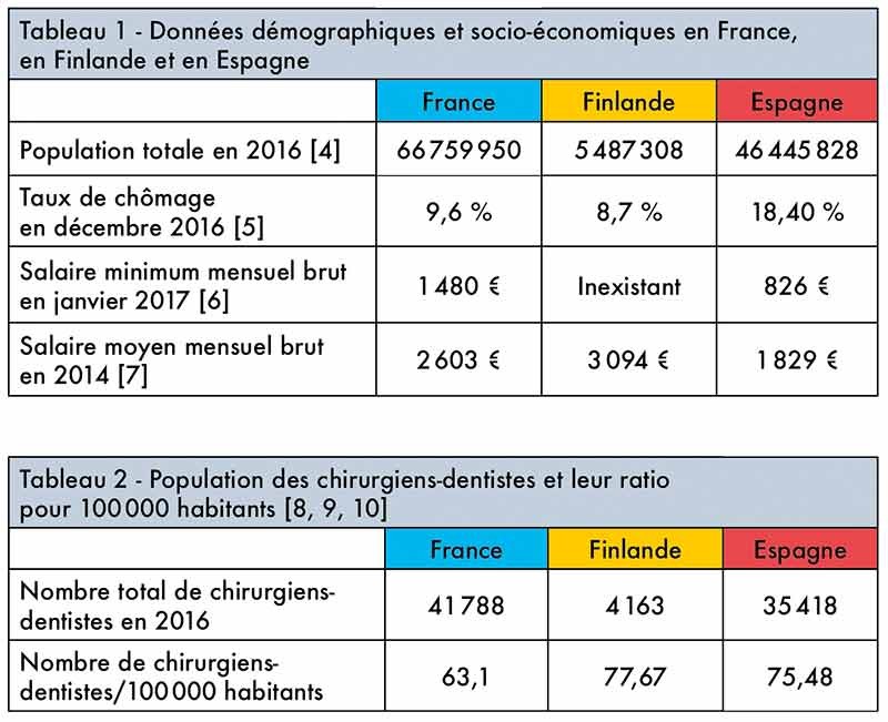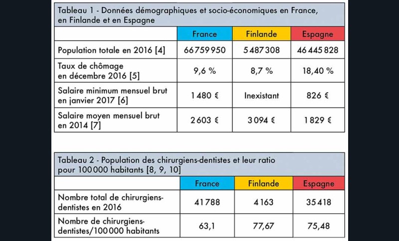 En France, la densité de chirurgiens- dentistes, bien que très inégalement répartie sur son territoire, est 18 % inférieure à celle rencontrée en Espagne et en Finlande [14]. Il est également intéressant d’observer que les hygiénistes, profession inexistante sur le territoire français, exercent au nombre de 1 490 en Finlande et 13 200 en Espagne [15].