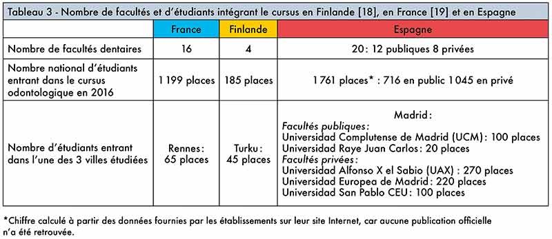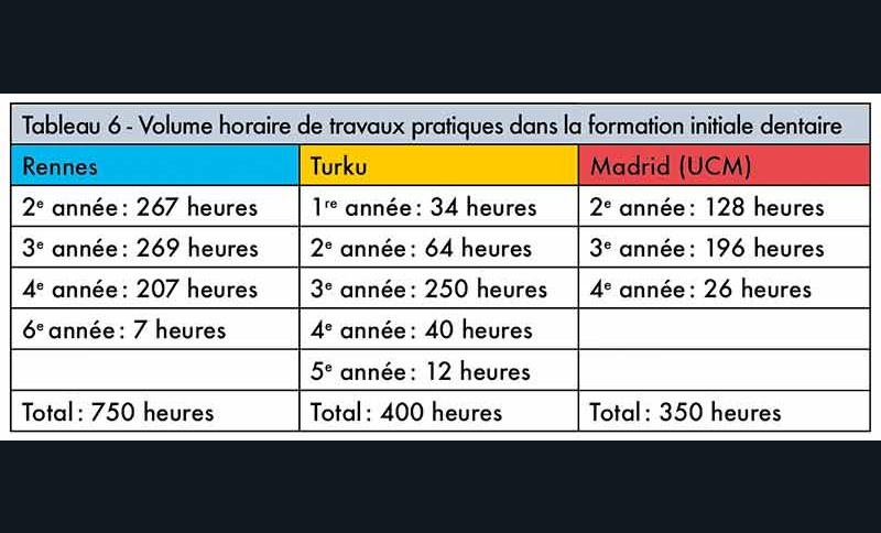 Du fait de l’absence de publication, le travail de récoltes des informations a été réalisé en collaboration avec les doyens et leur administration auprès de chacune des universités étudiées. Selon les directives européennes en vigueur [22], les trois formations doivent comptabiliser au moins 300 ECTS (European Credits Transfer System), soit 5 années de formation avec un total d’au moins 5 000 heures d’enseignement théorique et pratique. Avec la première année de PACES, la France possède le cursus le plus long. L’étudiant obtient, après 6 années d’études et la soutenance d’une thèse d’exercice, un diplôme d’état de docteur en chirurgie dentaire. Le curriculum espagnol dure 5 ans et celui de Finlande 5,5 années : ils n’aboutissent pas à un titre de docteur.