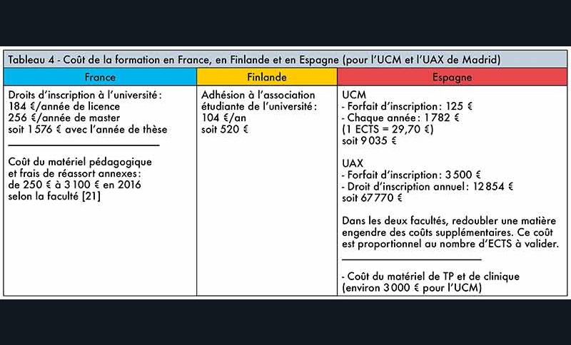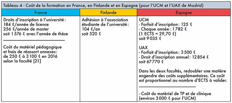 En Finlande, l’accès à l’université est quasiment gratuit. À l’inverse, en Espagne la formation est payante. Si le coût de la formation publique reste raisonnable, celui de l’école privée atteint 67 770 € à l’UAX. En ce qui concerne la France, le coût des études est faible. Au coût de l’inscription administrative universitaire s’ajoutent les dépenses pour l’acquisition de matériel pédagogique, variables selon les facultés.