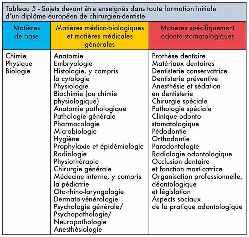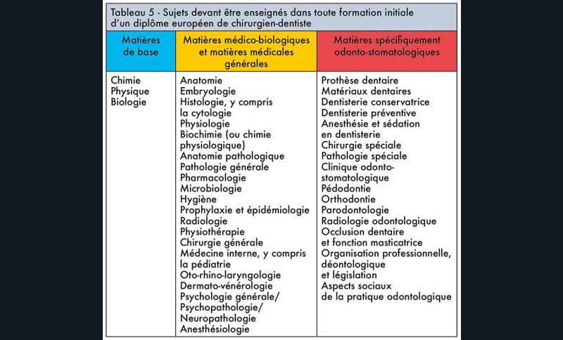 Pour être reconnue, la formation théorique doit comprendre un certain nombre d’enseignements définis dans la directive des qualifications professionnelles, listés dans le tableau 5 [22]. Les enseignements seront dispensés au travers de cours magistraux, de travaux dirigés, d’études de la littérature scientifique et de séminaires. Des cours et des supports sont disponibles sur une plateforme informatique (moodle pour Rennes et Turku, el campus virtual pour Madrid). Dans les trois universités étudiées, l’enseignement théorique concernera des connaissances médicales générales puis se concentrera sur les connaissances odontologiques spécifiques.